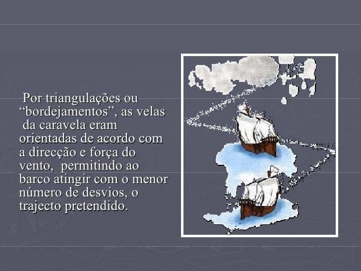 Por triangulações ou “bordejamentos”, as velas  da caravela eram orientadas de acordo com a direcção e força do vento,  pe...