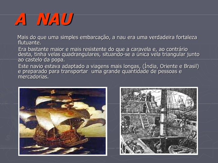 22. 22. <ul><li>A NAU </li></ul><ul><li>Mais do que uma simples embarcação, a nau era uma verdadeira fortaleza flutuante. </li></ul><ul><li>Era bastante maior e mais resistente do que a caravela e, ao contrário desta, tinha velas quadrangulares, situando-se a única vela triangular junto ao castelo da popa. </li></ul><ul><li>Este navio estava adaptado a viagens mais longas, (Índia, Oriente e Brasil) e preparado para transportar uma grande quantidade de pessoas e mercadorias. </li></ul>