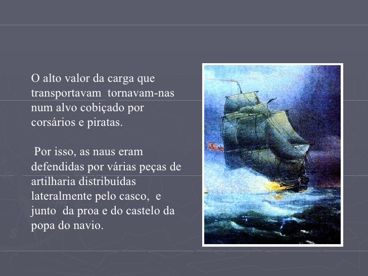 23. 23. O alto valor da carga que transportavam tornavam-nas num alvo cobiçado por corsários e piratas. Por isso, as naus eram defendidas por várias peças de artilharia distribuídas lateralmente pelo casco, e junto da proa e do castelo da popa do navio.