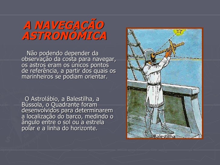 24. 24. <ul><li>A NAVEGAÇÃO ASTRONÓMICA </li></ul><ul><li>Não podendo depender da observação da costa para navegar, os astros eram os únicos pontos de referência, a partir dos quais os marinheiros se podiam orientar. </li></ul><ul><li>O Astrolábio, a Balestilha, a Bússola, o Quadrante foram desenvolvidos para determinarem a localização do barco, medindo o ângulo entre o sol ou a estrela polar e a linha do horizonte. </li></ul>