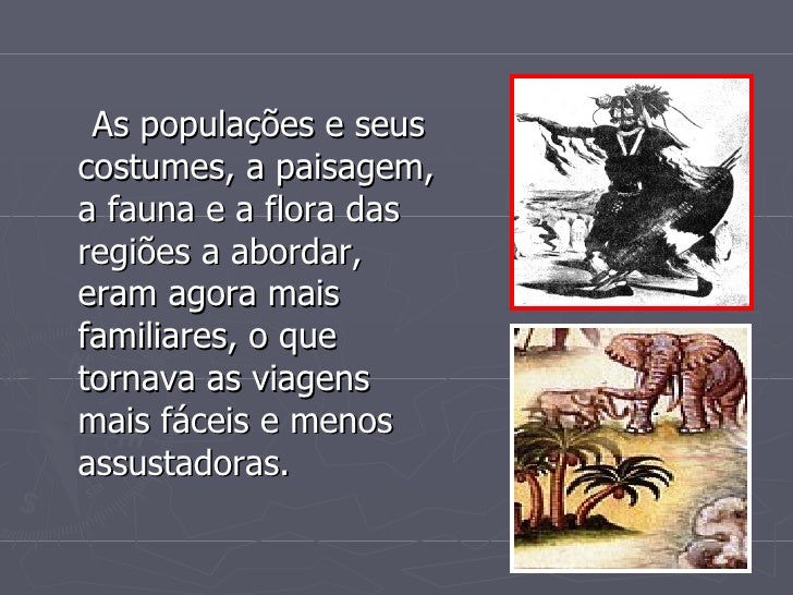 26. 26. <ul><li>As populações e seus costumes, a paisagem, a fauna e a flora das regiões a abordar, eram agora mais familiares, o que tornava as viagens mais fáceis e menos assustadoras. </li></ul>