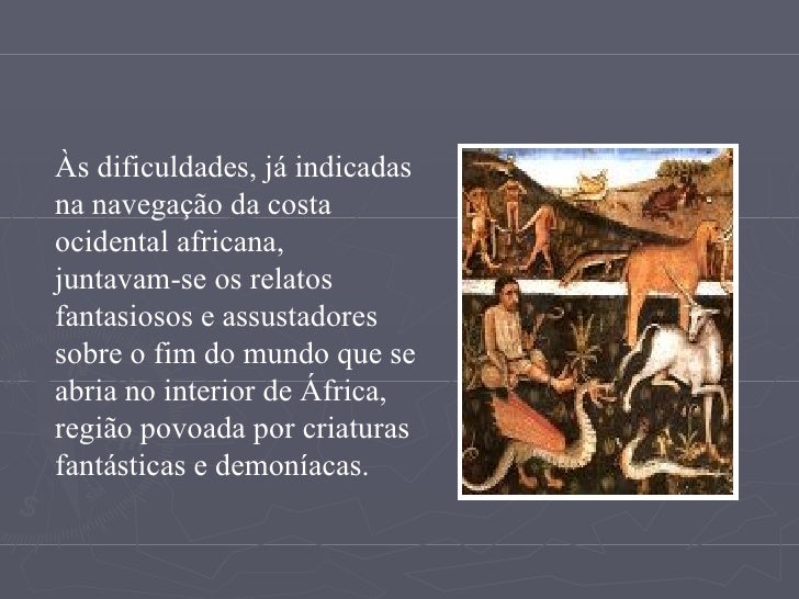 27. 27. Às dificuldades, já indicadas na navegação da costa ocidental africana, juntavam-se os relatos fantasiosos e assustadores sobre o fim do mundo que se abria no interior de África, região povoada por criaturas fantásticas e demoníacas.
