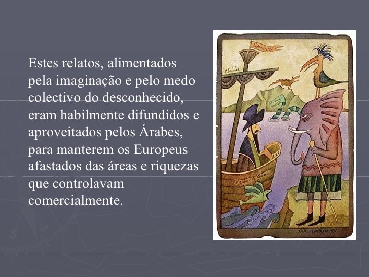 28. 28. Estes relatos, alimentados pela imaginação e pelo medo colectivo do desconhecido, eram habilmente difundidos e aproveitados pelos Árabes, para manterem os Europeus afastados das áreas e riquezas que controlavam comercialmente.