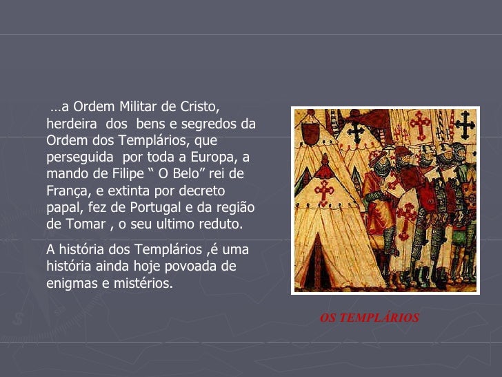 32. 32. … a Ordem Militar de Cristo, herdeira dos bens e segredos da Ordem dos Templários, que perseguida por toda a Europa, a mando de Filipe “ O Belo” rei de França, e extinta por decreto papal, fez de Portugal e da região de Tomar , o seu ultimo reduto. A história dos Templários ,é uma história ainda hoje povoada de enigmas e mistérios. OS TEMPLÁRIOS