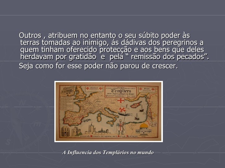 36. 36. <ul><li>Outros , atribuem no entanto o seu súbito poder às terras tomadas ao inimigo, ás dádivas dos peregrinos a quem tinham oferecido protecção e aos bens que deles herdavam por gratidão e pela “ remissão dos pecados”. </li></ul><ul><li>Seja como for esse poder não parou de crescer. </li></ul>A Influencia dos Templários no mundo