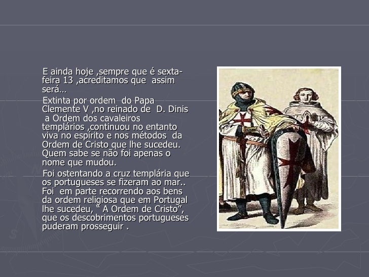 38. 38. <ul><li>E ainda hoje ,sempre que é sexta-feira 13 ,acreditamos que assim será… </li></ul><ul><li>Extinta por ordem do Papa Clemente V ,no reinado de D. Dinis a Ordem dos cavaleiros templários ,continuou no entanto viva no espírito e nos métodos da Ordem de Cristo que lhe sucedeu. Quem sabe se não foi apenas o nome que mudou. </li></ul><ul><li>Foi ostentando a cruz templária que os portugueses se fizeram ao mar.. Foi em parte recorrendo aos bens da ordem religiosa que em Portugal lhe sucedeu, “ A Ordem de Cristo”, que os descobrimentos portugueses puderam prosseguir . </li></ul>