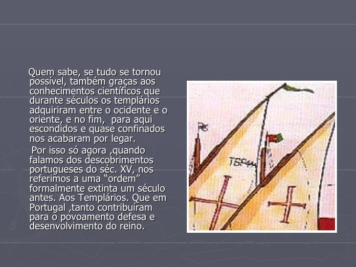39. 39. <ul><li>Quem sabe, se tudo se tornou possível, também graças aos conhecimentos científicos que durante séculos os templários adquiriram entre o ocidente e o oriente, e no fim, para aqui escondidos e quase confinados nos acabaram por legar. </li></ul><ul><li>Por isso só agora ,quando falamos dos descobrimentos portugueses do séc. XV, nos referimos a uma “ordem” formalmente extinta um século antes. Aos Templários. Que em Portugal ,tanto contribuíram para o povoamento defesa e desenvolvimento do reino. </li></ul>