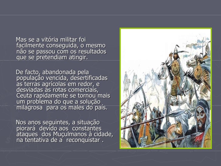 4. 4. <ul><li>Mas se a vitória militar foi facilmente conseguida, o mesmo não se passou com os resultados que se pretendiam atingir. </li></ul><ul><li>De facto, abandonada pela população vencida, desertificadas as terras agrícolas em redor, e desviadas as rotas comerciais, Ceuta rapidamente se tornou mais um problema do que a solução milagrosa para os males do país. </li></ul><ul><li>Nos anos seguintes, a situação piorará devido aos constantes ataques dos Muçulmanos à cidade, na tentativa de a reconquistar . </li></ul>