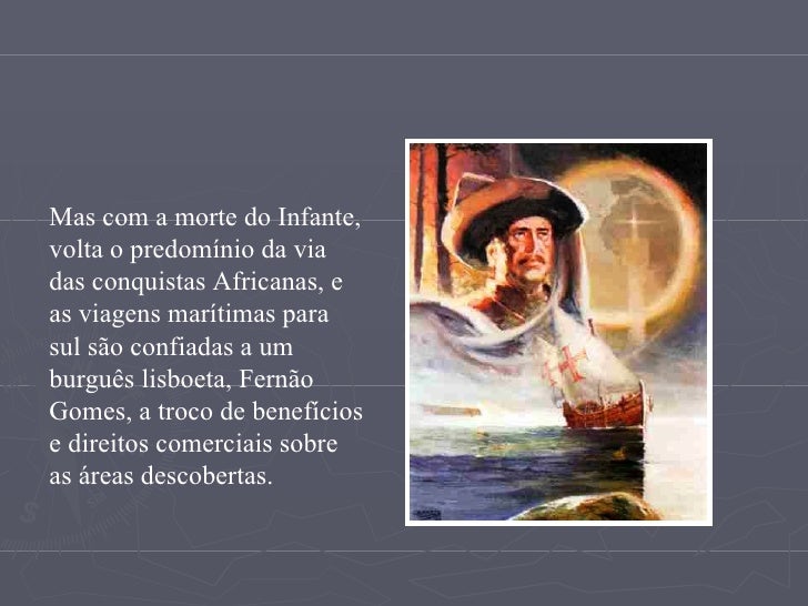 42. 42. Mas com a morte do Infante, volta o predomínio da via das conquistas Africanas, e as viagens marítimas para sul são confiadas a um burguês lisboeta, Fernão Gomes, a troco de benefícios e direitos comerciais sobre as áreas descobertas.
