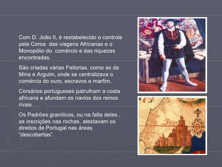 43. 43. Com D. João II, é restabelecido o controle pela Coroa das viagens Africanas e o Monopólio do comércio e das riquezas encontradas. São criadas várias Feitorias, como as da Mina e Arguim, onde se centralizava o comércio do ouro, escravos e marfim. Corsários portugueses patrulham a costa africana e afundam os navios dos reinos rivais. Os Padrões graníticos, ou na falta deles , as inscrições nas rochas, atestavam os direitos de Portugal nas áreas “descobertas”.