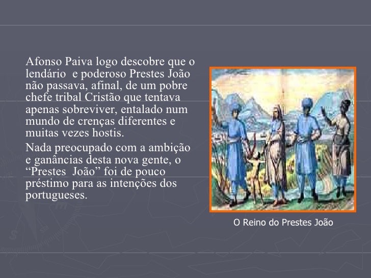 46. 46. Afonso Paiva logo descobre que o lendário e poderoso Prestes João não passava, afinal, de um pobre chefe tribal Cristão que tentava apenas sobreviver, entalado num mundo de crenças diferentes e muitas vezes hostis. Nada preocupado com a ambição e ganâncias desta nova gente, o “Prestes João” foi de pouco préstimo para as intenções dos portugueses. O Reino do Prestes João