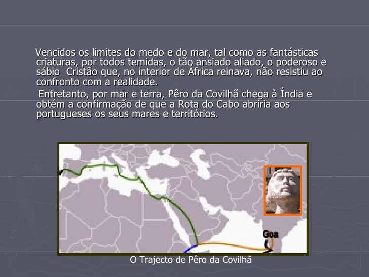 47. 47. <ul><li>Vencidos os limites do medo e do mar, tal como as fantásticas criaturas, por todos temidas, o tão ansiado aliado, o poderoso e sábio Cristão que, no interior de África reinava, não resistiu ao confronto com a realidade. </li></ul><ul><li>Entretanto, por mar e terra, Pêro da Covilhã chega à Índia e obtém a confirmação de que a Rota do Cabo abriria aos portugueses os seus mares e territórios. </li></ul>O Trajecto de Pêro da Covilhã