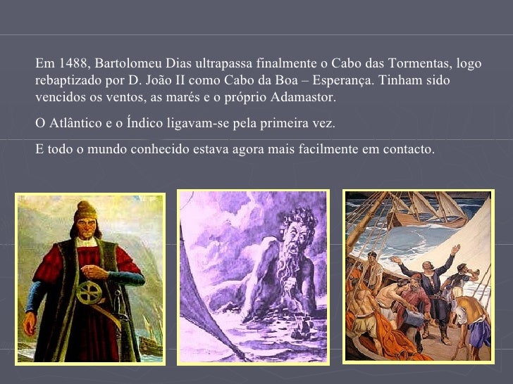 Em 1488, Bartolomeu Dias ultrapassa finalmente o Cabo das Tormentas, logo rebaptizado por D. João II como Cabo da Boa – Es...