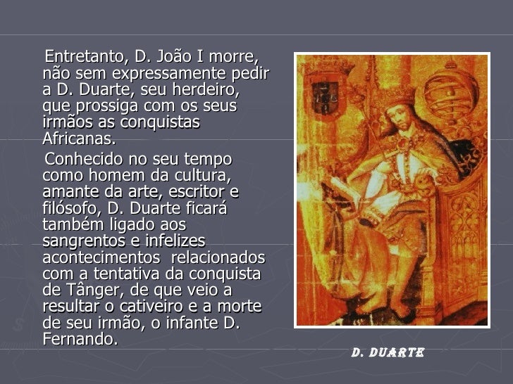 5. 5. <ul><li>Entretanto, D. João I morre, não sem expressamente pedir a D. Duarte, seu herdeiro, que prossiga com os seus irmãos as conquistas Africanas. </li></ul><ul><li>Conhecido no seu tempo como homem da cultura, amante da arte, escritor e filósofo, D. Duarte ficará também ligado aos sangrentos e infelizes acontecimentos relacionados com a tentativa da conquista de Tânger, de que veio a resultar o cativeiro e a morte de seu irmão, o infante D. Fernando. </li></ul>D. DUARTE