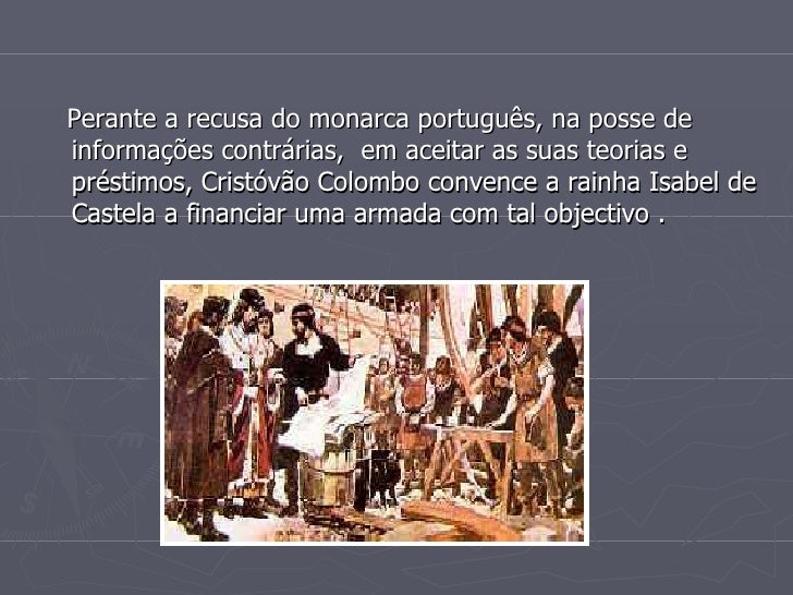 50. 50. <ul><li>Perante a recusa do monarca português, na posse de informações contrárias, em aceitar as suas teorias e préstimos, Cristóvão Colombo convence a rainha Isabel de Castela a financiar uma armada com tal objectivo . </li></ul>