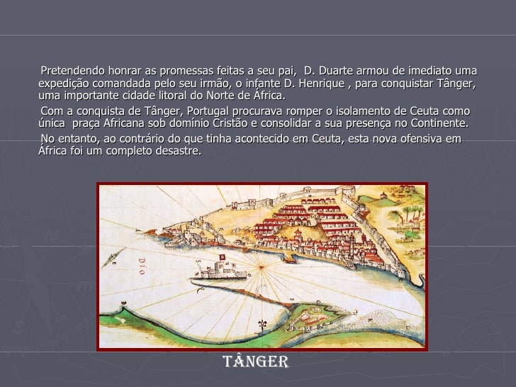 6. 6. <ul><li>Pretendendo honrar as promessas feitas a seu pai, D. Duarte armou de imediato uma expedição comandada pelo seu irmão, o infante D. Henrique , para conquistar Tânger, uma importante cidade litoral do Norte de África. </li></ul><ul><li>Com a conquista de Tânger, Portugal procurava romper o isolamento de Ceuta como única praça Africana sob domínio Cristão e consolidar a sua presença no Continente. </li></ul><ul><li>No entanto, ao contrário do que tinha acontecido em Ceuta, esta nova ofensiva em África foi um completo desastre. </li></ul>TÂNGER