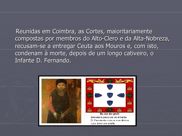 8. 8. <ul><li>Reunidas em Coimbra, as Cortes, maioritariamente compostas por membros do Alto-Clero e da Alta-Nobreza, recusam-se a entregar Ceuta aos Mouros e, com isto, condenam à morte, depois de um longo cativeiro, o Infante D. Fernando. </li></ul>