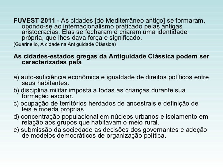 3. 9. <ul><li>FUVEST 2011 - As cidades [do Mediterrâneo antigo] se formaram, opondo-se ao internacionalismo praticado pelas antigas aristocracias. Elas se fecharam e criaram uma identidade própria, que lhes dava força e significado. </li></ul><ul><li>(Guarinello, A cidade na Antiguidade Clássica) </li></ul><ul><li>As cidades-estados gregas da Antiguidade Clássica podem ser caracterizadas pela </li></ul><ul><li>a) auto-suficiência econômica e igualdade de direitos políticos entre seus habitantes. </li></ul><ul><li>b) disciplina militar imposta a todas as crianças durante sua formação escolar. </li></ul><ul><li>c) ocupação de territórios herdados de ancestrais e definição de leis e moeda próprias. </li></ul><ul><li>d) concentração populacional em núcleos urbanos e isolamento em relação aos grupos que habitavam o meio rural. </li></ul><ul><li>e) submissão da sociedade as decisões dos governantes e adoção de modelos democráticos de organização política. </li></ul>
