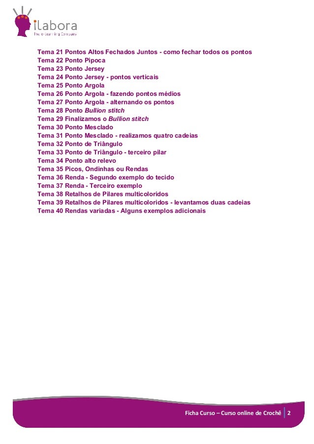 2. 2. Ficha Curso – Curso online de Crochê 2 Tema 21 Pontos Altos Fechados Juntos - como fechar todos os pontos Tema 22 Ponto Pipoca Tema 23 Ponto Jersey Tema 24 Ponto Jersey - pontos verticais Tema 25 Ponto Argola Tema 26 Ponto Argola - fazendo pontos médios Tema 27 Ponto Argola - alternando os pontos Tema 28 Ponto Bullion stitch Tema 29 Finalizamos o Bullion stitch Tema 30 Ponto Mesclado Tema 31 Ponto Mesclado - realizamos quatro cadeias Tema 32 Ponto de Triângulo Tema 33 Ponto de Triângulo - terceiro pilar Tema 34 Ponto alto relevo Tema 35 Picos, Ondinhas ou Rendas Tema 36 Renda - Segundo exemplo do tecido Tema 37 Renda - Terceiro exemplo Tema 38 Retalhos de Pilares multicoloridos Tema 39 Retalhos de Pilares multicoloridos - levantamos duas cadeias Tema 40 Rendas variadas - Alguns exemplos adicionais