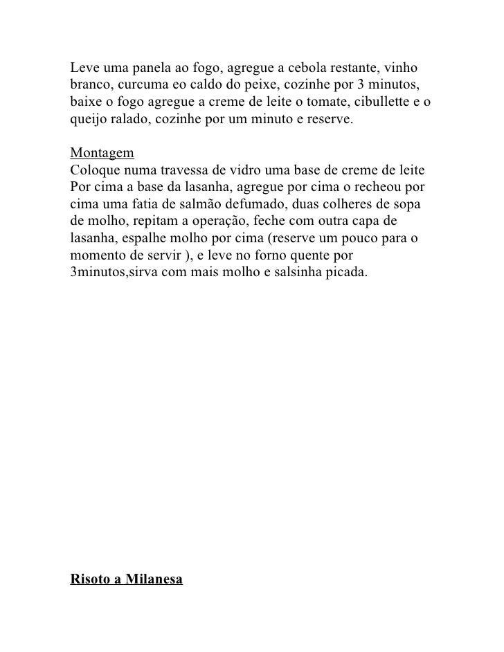 11. 11. Leve uma panela ao fogo, agregue a cebola restante, vinho branco, curcuma eo caldo do peixe, cozinhe por 3 minutos, baixe o fogo agregue a creme de leite o tomate, cibullette e o queijo ralado, cozinhe por um minuto e reserve. Montagem Coloque numa travessa de vidro uma base de creme de leite Por cima a base da lasanha, agregue por cima o recheou por cima uma fatia de salmão defumado, duas colheres de sopa de molho, repitam a operação, feche com outra capa de lasanha, espalhe molho por cima (reserve um pouco para o momento de servir ), e leve no forno quente por 3minutos,sirva com mais molho e salsinha picada. Risoto a Milanesa