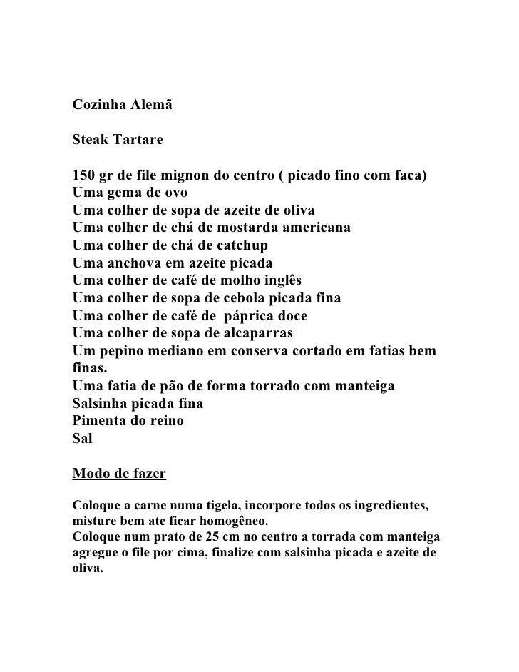 15. 15. Cozinha Alemã Steak Tartare 150 gr de file mignon do centro ( picado fino com faca) Uma gema de ovo Uma colher de sopa de azeite de oliva Uma colher de chá de mostarda americana Uma colher de chá de catchup Uma anchova em azeite picada Uma colher de café de molho inglês Uma colher de sopa de cebola picada fina Uma colher de café de páprica doce Uma colher de sopa de alcaparras Um pepino mediano em conserva cortado em fatias bem finas. Uma fatia de pão de forma torrado com manteiga Salsinha picada fina Pimenta do reino Sal Modo de fazer Coloque a carne numa tigela, incorpore todos os ingredientes, misture bem ate ficar homogêneo. Coloque num prato de 25 cm no centro a torrada com manteiga agregue o file por cima, finalize com salsinha picada e azeite de oliva.