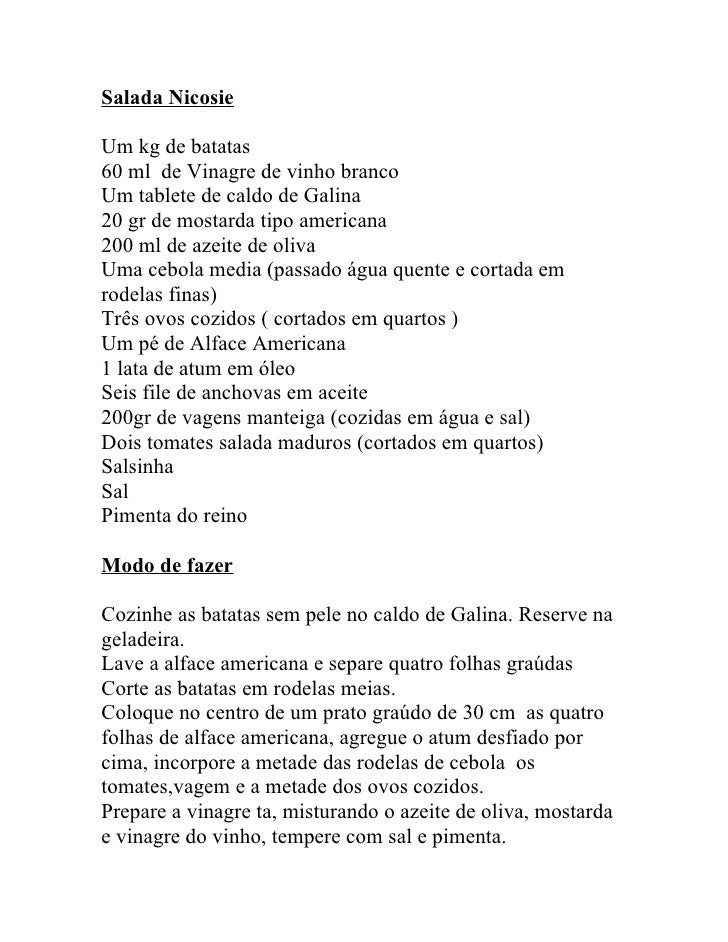 2. 2. Salada Nicosie Um kg de batatas 60 ml de Vinagre de vinho branco Um tablete de caldo de Galina 20 gr de mostarda tipo americana 200 ml de azeite de oliva Uma cebola media (passado água quente e cortada em rodelas finas) Três ovos cozidos ( cortados em quartos ) Um pé de Alface Americana 1 lata de atum em óleo Seis file de anchovas em aceite 200gr de vagens manteiga (cozidas em água e sal) Dois tomates salada maduros (cortados em quartos) Salsinha Sal Pimenta do reino Modo de fazer Cozinhe as batatas sem pele no caldo de Galina. Reserve na geladeira. Lave a alface americana e separe quatro folhas graúdas Corte as batatas em rodelas meias. Coloque no centro de um prato graúdo de 30 cm as quatro folhas de alface americana, agregue o atum desfiado por cima, incorpore a metade das rodelas de cebola os tomates,vagem e a metade dos ovos cozidos. Prepare a vinagre ta, misturando o azeite de oliva, mostarda e vinagre do vinho, tempere com sal e pimenta.