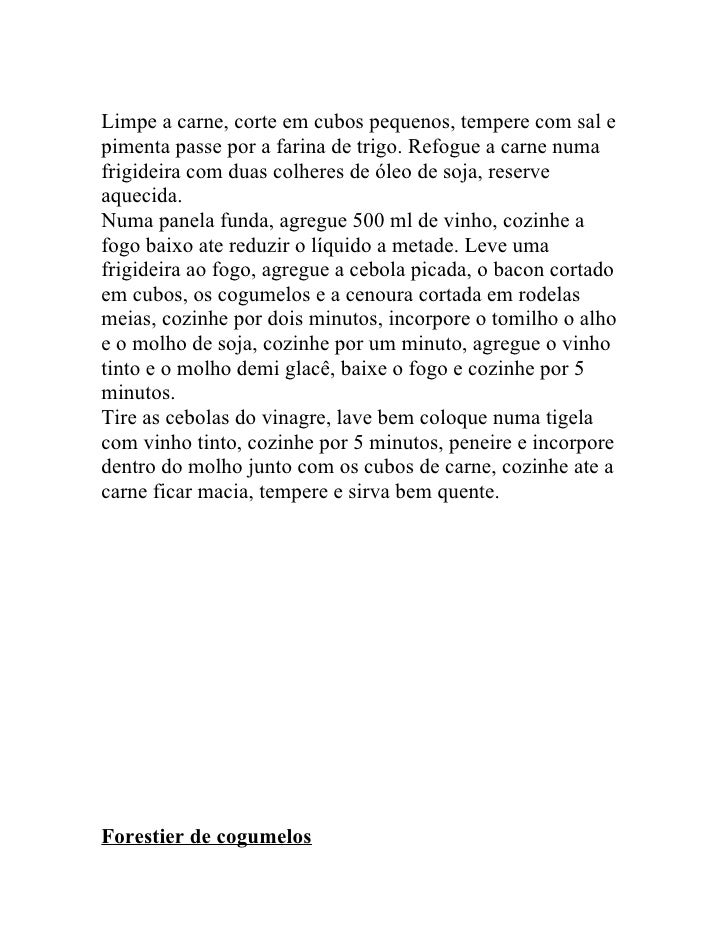 6. 6. Limpe a carne, corte em cubos pequenos, tempere com sal e pimenta passe por a farina de trigo. Refogue a carne numa frigideira com duas colheres de óleo de soja, reserve aquecida. Numa panela funda, agregue 500 ml de vinho, cozinhe a fogo baixo ate reduzir o líquido a metade. Leve uma frigideira ao fogo, agregue a cebola picada, o bacon cortado em cubos, os cogumelos e a cenoura cortada em rodelas meias, cozinhe por dois minutos, incorpore o tomilho o alho e o molho de soja, cozinhe por um minuto, agregue o vinho tinto e o molho demi glacê, baixe o fogo e cozinhe por 5 minutos. Tire as cebolas do vinagre, lave bem coloque numa tigela com vinho tinto, cozinhe por 5 minutos, peneire e incorpore dentro do molho junto com os cubos de carne, cozinhe ate a carne ficar macia, tempere e sirva bem quente. Forestier de cogumelos