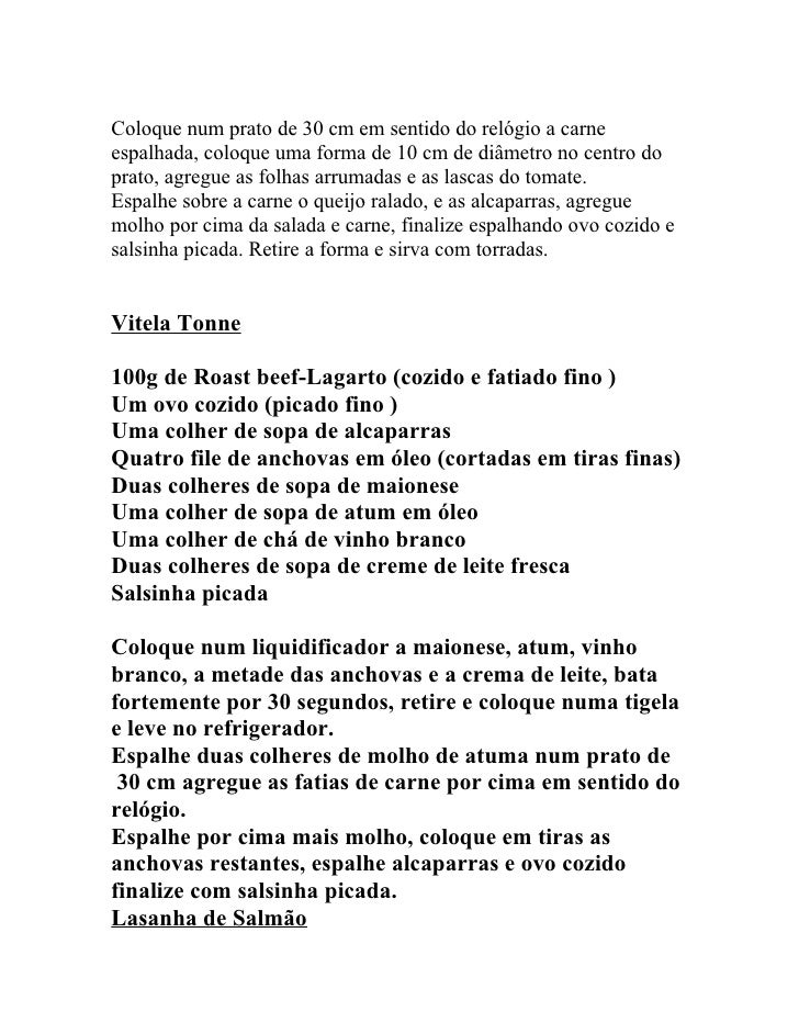 9. 9. Coloque num prato de 30 cm em sentido do relógio a carne espalhada, coloque uma forma de 10 cm de diâmetro no centro do prato, agregue as folhas arrumadas e as lascas do tomate. Espalhe sobre a carne o queijo ralado, e as alcaparras, agregue molho por cima da salada e carne, finalize espalhando ovo cozido e salsinha picada. Retire a forma e sirva com torradas. Vitela Tonne 100g de Roast beef-Lagarto (cozido e fatiado fino ) Um ovo cozido (picado fino ) Uma colher de sopa de alcaparras Quatro file de anchovas em óleo (cortadas em tiras finas) Duas colheres de sopa de maionese Uma colher de sopa de atum em óleo Uma colher de chá de vinho branco Duas colheres de sopa de creme de leite fresca Salsinha picada Coloque num liquidificador a maionese, atum, vinho branco, a metade das anchovas e a crema de leite, bata fortemente por 30 segundos, retire e coloque numa tigela e leve no refrigerador. Espalhe duas colheres de molho de atuma num prato de 30 cm agregue as fatias de carne por cima em sentido do relógio. Espalhe por cima mais molho, coloque em tiras as anchovas restantes, espalhe alcaparras e ovo cozido finalize com salsinha picada. Lasanha de Salmão
