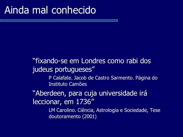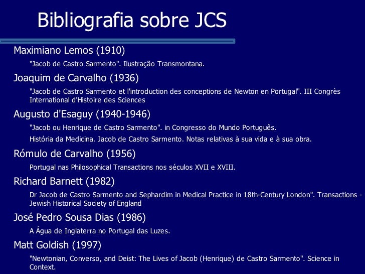 J. P. Sousa Dias. "Jacob de Castro Sarmento (1691-1762) e a conversão à ciência moderna". Comunicação ao Primeiro Encontro de História das Ciências Naturais e da Saúde (Arrábida, Julho de 2004). Texto integral da comunicação: http://ircabral.org/shfc/index.php?option=com_docman&task=doc_details&gid=4&Itemid=123