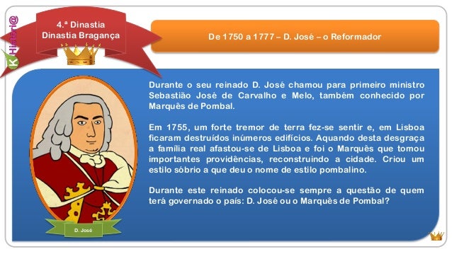 9. 9. Durante o seu reinado D. José chamou para primeiro ministro Sebastião José de Carvalho e Melo, também conhecido por Marquês de Pombal. Em 1755, um forte tremor de terra fez-se sentir e, em Lisboa ficaram destruídos inúmeros edifícios. Aquando desta desgraça a família real afastou-se de Lisboa e foi o Marquês que tomou importantes providências, reconstruindo a cidade. Criou um estilo sóbrio a que deu o nome de estilo pombalino. Durante este reinado colocou-se sempre a questão de quem terá governado o país: D. José ou o Marquês de Pombal? De 1750 a 1777 – D. José – o Reformador 4.ª Dinastia Dinastia Bragança D. José