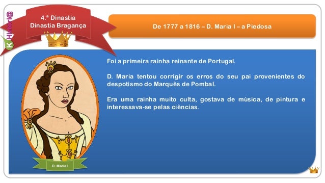 10. 10. Foi a primeira rainha reinante de Portugal. D. Maria tentou corrigir os erros do seu pai provenientes do despotismo do Marquês de Pombal. Era uma rainha muito culta, gostava de música, de pintura e interessava-se pelas ciências. De 1777 a 1816 – D. Maria I – a Piedosa 4.ª Dinastia Dinastia Bragança D. Maria I