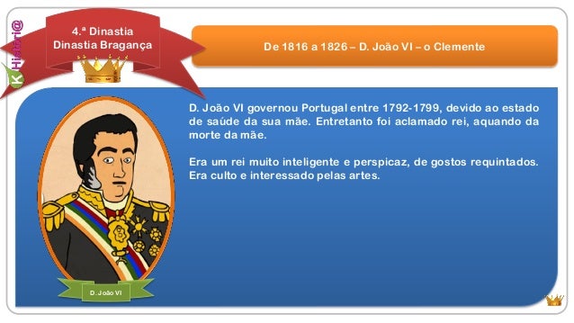 11. 11. D. João VI governou Portugal entre 1792-1799, devido ao estado de saúde da sua mãe. Entretanto foi aclamado rei, aquando da morte da mãe. Era um rei muito inteligente e perspicaz, de gostos requintados. Era culto e interessado pelas artes. De 1816 a 1826 – D. João VI – o Clemente 4.ª Dinastia Dinastia Bragança D. João VI