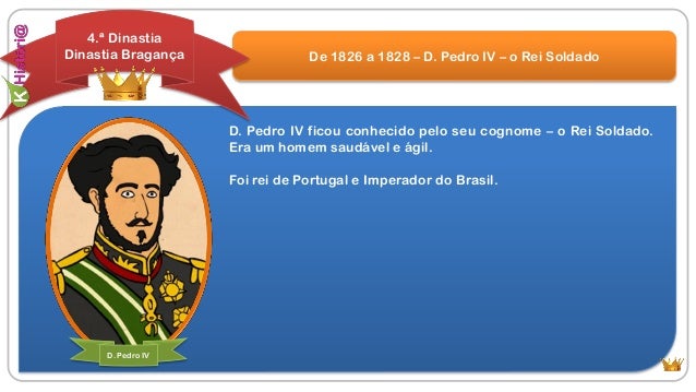 12. 12. D. Pedro IV ficou conhecido pelo seu cognome – o Rei Soldado. Era um homem saudável e ágil. Foi rei de Portugal e Imperador do Brasil. De 1826 a 1828 – D. Pedro IV – o Rei Soldado 4.ª Dinastia Dinastia Bragança D. Pedro IV
