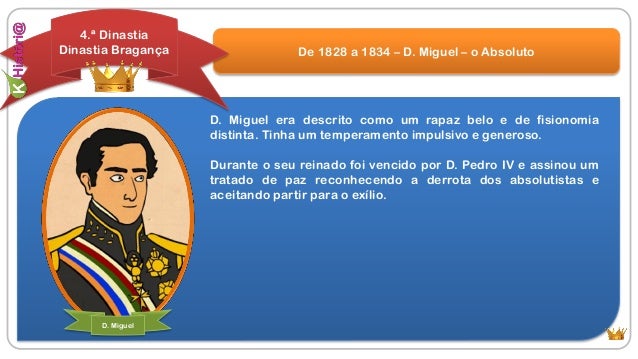 13. 13. D. Miguel era descrito como um rapaz belo e de fisionomia distinta. Tinha um temperamento impulsivo e generoso. Durante o seu reinado foi vencido por D. Pedro IV e assinou um tratado de paz reconhecendo a derrota dos absolutistas e aceitando partir para o exílio. De 1828 a 1834 – D. Miguel – o Absoluto 4.ª Dinastia Dinastia Bragança D. Miguel