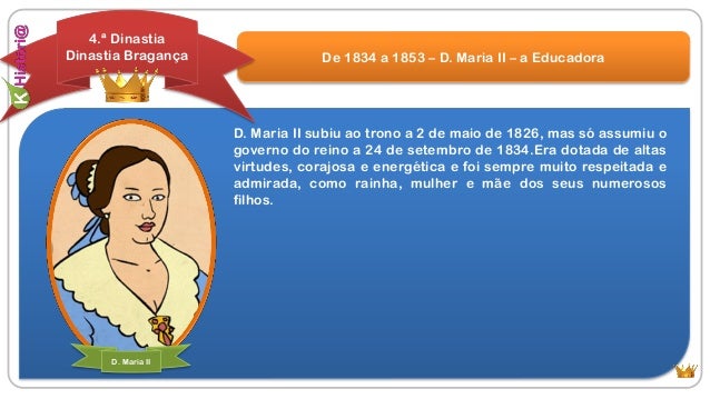 14. 14. D. Maria II subiu ao trono a 2 de maio de 1826, mas só assumiu o governo do reino a 24 de setembro de 1834.Era dotada de altas virtudes, corajosa e energética e foi sempre muito respeitada e admirada, como rainha, mulher e mãe dos seus numerosos filhos. De 1834 a 1853 – D. Maria II – a Educadora 4.ª Dinastia Dinastia Bragança D. Maria II