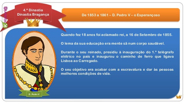 15. 15. Quando fez 18 anos foi aclamado rei, a 16 de Setembro de 1855. O lema da sua educação era mente sã num corpo saudável. Durante o seu reinado, presidiu à inauguração do 1.º telégrafo elétrico no país e inaugurou o caminho de ferro que ligava Lisboa ao Carregado. O seu objetivo era acabar com a escravatura e dar às pessoas melhores condições de vida. De 1853 a 1861 – D. Pedro V – o Esperançoso 4.ª Dinastia Dinastia Bragança D. Pedro V