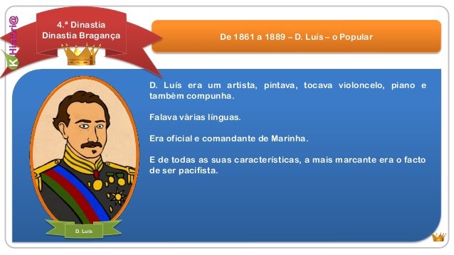 16. 16. D. Luís era um artista, pintava, tocava violoncelo, piano e também compunha. Falava várias línguas. Era oficial e comandante de Marinha. E de todas as suas características, a mais marcante era o facto de ser pacifista. De 1861 a 1889 – D. Luís – o Popular 4.ª Dinastia Dinastia Bragança D. Luís