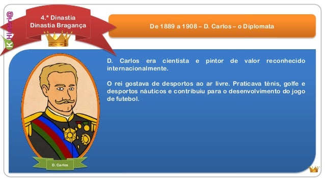 17. 17. D. Carlos era cientista e pintor de valor reconhecido internacionalmente. O rei gostava de desportos ao ar livre. Praticava ténis, golfe e desportos náuticos e contribuiu para o desenvolvimento do jogo de futebol. De 1889 a 1908 – D. Carlos – o Diplomata 4.ª Dinastia Dinastia Bragança D. Carlos