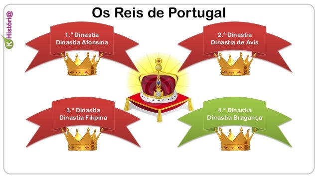 1. 1. 1.ª Dinastia Dinastia Afonsina 2.ª Dinastia Dinastia de Avis 3.ª Dinastia Dinastia Filipina 4.ª Dinastia Dinastia Bragança Os Reis de Portugal