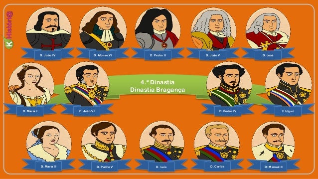 4. 4. 4.ª Dinastia Dinastia Bragança D. João IV D. Afonso VI D. Pedro II D. João V D. José D. Maria I D. João VI D. Pedro IV D. Miguel D. Maria II D. Pedro V D. Luís D. Carlos D: Manuel II