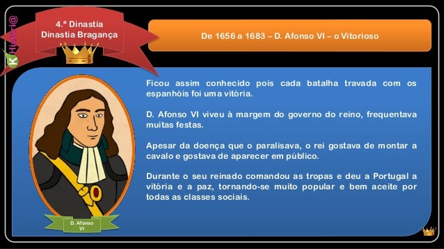 6. 6. Ficou assim conhecido pois cada batalha travada com os espanhóis foi uma vitória. D. Afonso VI viveu à margem do governo do reino, frequentava muitas festas. Apesar da doença que o paralisava, o rei gostava de montar a cavalo e gostava de aparecer em público. Durante o seu reinado comandou as tropas e deu a Portugal a vitória e a paz, tornando-se muito popular e bem aceite por todas as classes sociais. De 1656 a 1683 – D. Afonso VI – o Vitorioso 4.ª Dinastia Dinastia Bragança D. Afonso VI