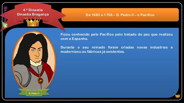 7. 7. Ficou conhecido pelo Pacífico pelo tratado de paz que realizou com a Espanha. Durante o seu reinado foram criadas novas industrias e modernizou as fábricas já existentes. De 1683 a 1706 – D. Pedro II – o Pacífico 4.ª Dinastia Dinastia Bragança D. Pedro II