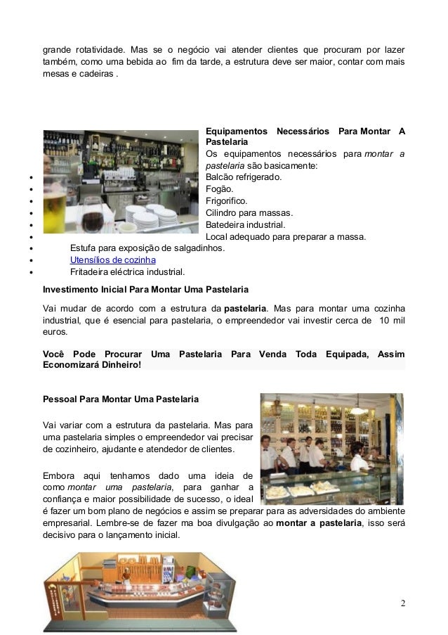 2. 2. grande rotatividade. Mas se o negócio vai atender clientes que procuram por lazer também, como uma bebida ao fim da tarde, a estrutura deve ser maior, contar com mais mesas e cadeiras . Equipamentos Necessários Para Montar A Pastelaria Os equipamentos necessários para montar a pastelaria são basicamente: • Balcão refrigerado. • Fogão. • Frigorifico. • Cilindro para massas. • Batedeira industrial. • Local adequado para preparar a massa. • Estufa para exposição de salgadinhos. • Utensílios de cozinha • Fritadeira eléctrica industrial. Investimento Inicial Para Montar Uma Pastelaria Vai mudar de acordo com a estrutura da pastelaria. Mas para montar uma cozinha industrial, que é esencial para pastelaria, o empreendedor vai investir cerca de 10 mil euros. Você Pode Procurar Uma Pastelaria Para Venda Toda Equipada, Assim Economizará Dinheiro! Pessoal Para Montar Uma Pastelaria Vai variar com a estrutura da pastelaria. Mas para uma pastelaria simples o empreendedor vai precisar de cozinheiro, ajudante e atendedor de clientes. Embora aqui tenhamos dado uma ideia de como montar uma pastelaria, para ganhar a confiança e maior possibilidade de sucesso, o ideal é fazer um bom plano de negócios e assim se preparar para as adversidades do ambiente empresarial. Lembre-se de fazer ma boa divulgação ao montar a pastelaria, isso será decisivo para o lançamento inicial. 2