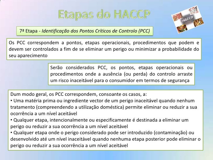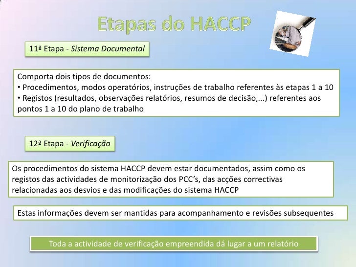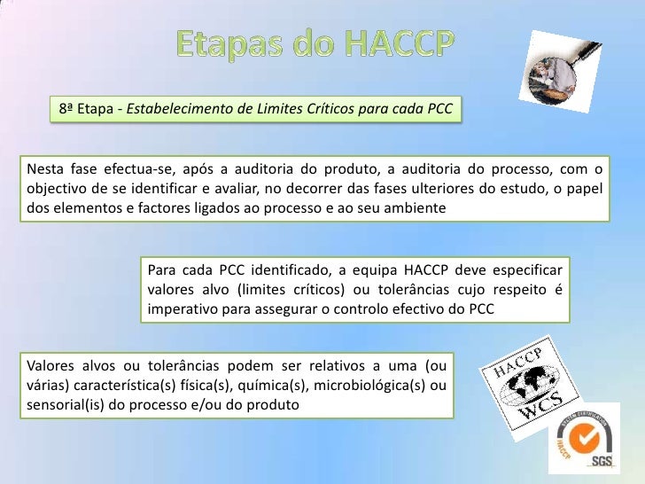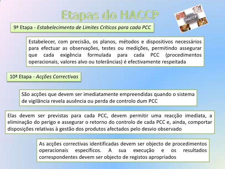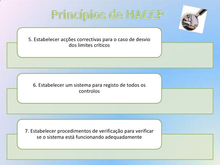 4. 4. 5. Estabelecer acções correctivas para o caso de desvio dos limites críticos 6. Estabelecer um sistema para registo de todos os controlos 7. Estabelecer procedimentos de verificação para verificar se o sistema está funcionando adequadamente