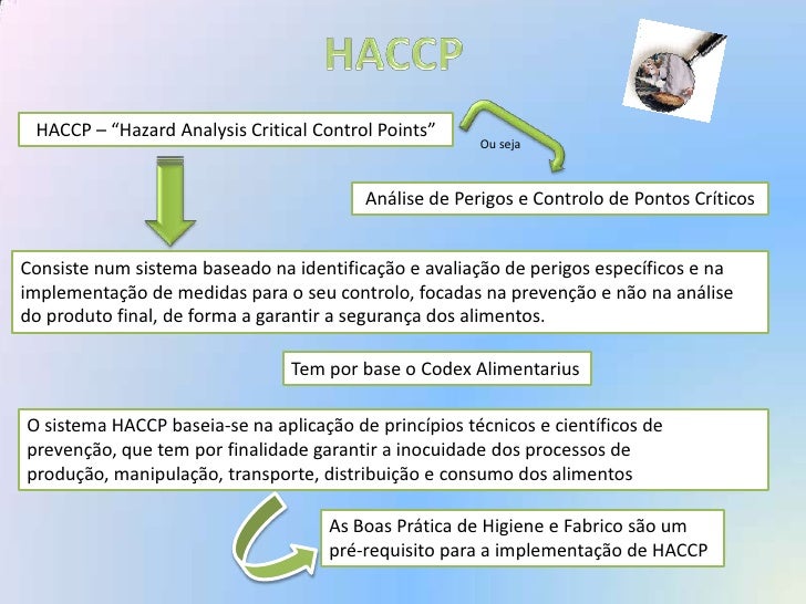 1. 1. HACCP – “Hazard Analysis Critical Control Points” Ou seja Análise de Perigos e Controlo de Pontos Críticos Consiste num sistema baseado na identificação e avaliação de perigos específicos e na implementação de medidas para o seu controlo, focadas na prevenção e não na análise do produto final, de forma a garantir a segurança dos alimentos. Tem por base o Codex Alimentarius O sistema HACCP baseia-se na aplicação de princípios técnicos e científicos de prevenção, que tem por finalidade garantir a inocuidade dos processos de produção, manipulação, transporte, distribuição e consumo dos alimentos As Boas Prática de Higiene e Fabrico são um pré-requisito para a implementação de HACCP