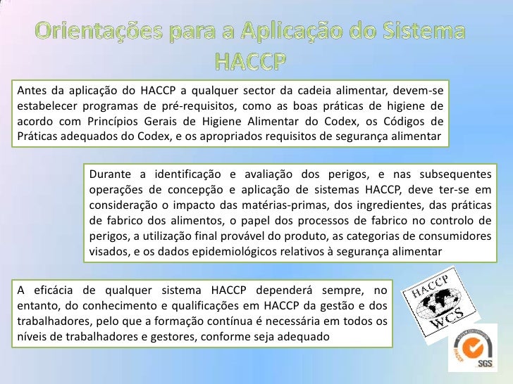 2. 2. Antes da aplicação do HACCP a qualquer sector da cadeia alimentar, devem-se estabelecer programas de pré-requisitos, como as boas práticas de higiene de acordo com Princípios Gerais de Higiene Alimentar do Codex, os Códigos de Práticas adequados do Codex, e os apropriados requisitos de segurança alimentar Durante a identificação e avaliação dos perigos, e nas subsequentes operações de concepção e aplicação de sistemas HACCP, deve ter-se em consideração o impacto das matérias-primas, dos ingredientes, das práticas de fabrico dos alimentos, o papel dos processos de fabrico no controlo de perigos, a utilização final provável do produto, as categorias de consumidores visados, e os dados epidemiológicos relativos à segurança alimentar A eficácia de qualquer sistema HACCP dependerá sempre, no entanto, do conhecimento e qualificações em HACCP da gestão e dos trabalhadores, pelo que a formação contínua é necessária em todos os níveis de trabalhadores e gestores, conforme seja adequado