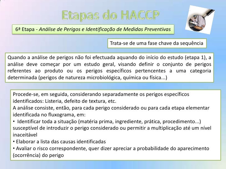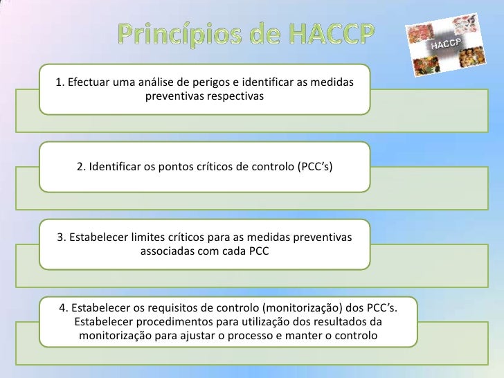 3. 3. 1. Efectuar uma análise de perigos e identificar as medidas preventivas respectivas 2. Identificar os pontos críticos de controlo (PCC’s) 3. Estabelecer limites críticos para as medidas preventivas associadas com cada PCC 4. Estabelecer os requisitos de controlo (monitorização) dos PCC’s. Estabelecer procedimentos para utilização dos resultados da monitorização para ajustar o processo e manter o controlo