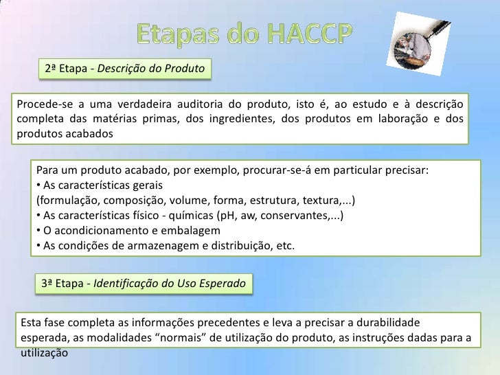 6. 6. 2ª Etapa - Descrição do Produto Procede-se a uma verdadeira auditoria do produto, isto é, ao estudo e à descrição completa das matérias primas, dos ingredientes, dos produtos em laboração e dos produtos acabados Para um produto acabado, por exemplo, procurar-se-á em particular precisar: • As características gerais (formulação, composição, volume, forma, estrutura, textura,...) • As características físico - químicas (pH, aw, conservantes,...) • O acondicionamento e embalagem • As condições de armazenagem e distribuição, etc. 3ª Etapa - Identificação do Uso Esperado Esta fase completa as informações precedentes e leva a precisar a durabilidade esperada, as modalidades “normais” de utilização do produto, as instruções dadas para a utilização