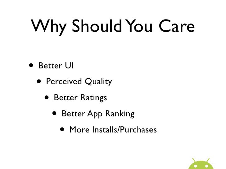 6. 6. Why Should You Care• Better UI • Perceived Quality • Better Ratings • Better App Ranking • More Installs/Purchases