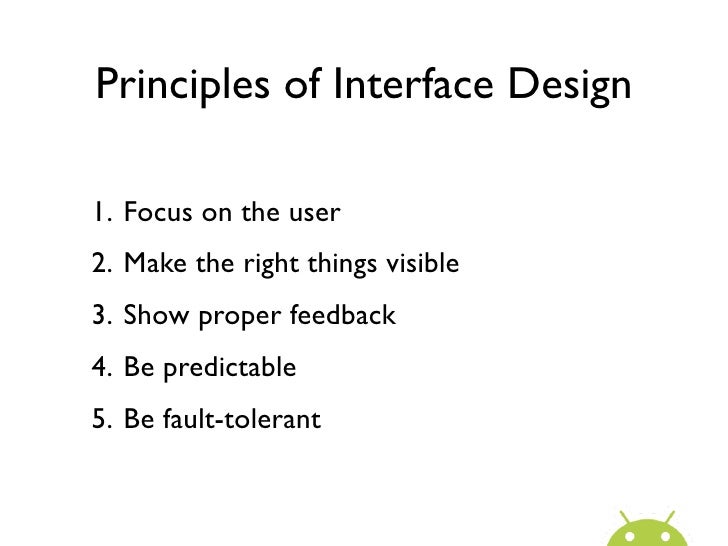 12. 12. Principles of Interface Design1. Focus on the user2. Make the right things visible3. Show proper feedback4. Be predictable5. Be fault-tolerant
